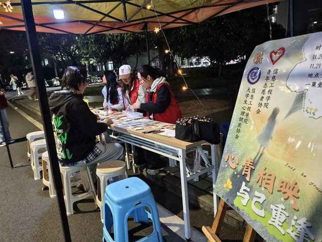 2025年11月20日至21日,信息工程学院青年志愿者协会与大学生心理协会联合举办“心青相映,与己相逢”心理健康主题摆点活动,帮助同学们缓解情绪压力,收获轻松心情。