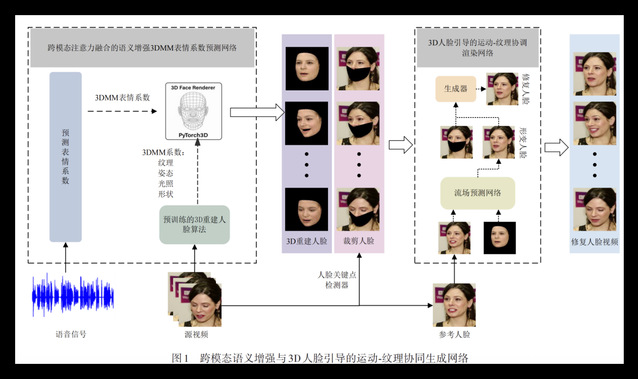 研究围绕真实场景视觉配音难题,提出以“运动-纹理协同融合”驱动的高保真生成框架,为复杂头动条件下的自然口型合成带来新突破。团队指出,传统视觉配音在头部转动、侧脸或遮挡时易产生唇周纹理模糊与修复不连续的“补丁感”。为此,论文引入3D可变形人脸模型作为中间表示,将任务分为“语音驱动三维表情运动预测”和“运动引导纹理生成渲染”两阶段:先让人脸运动精准可控,再用运动信息反向约束纹理补偿,从源头提升几何一致性与纹理真实度。研究的核心创新在运动与纹理的联合建模,渲染阶段通过语义引导的运动流场实现全局非刚性对齐,确保跨姿态下“动得对”;随后运动感知纹理调制模块在流场约束下调制多尺度纹理特征,把运动结构直接转化为纹理生成先验,稳定恢复嘴唇与唇周高频细节;再结合多参考纹理与自适应融合,兼顾全局运动一致与局部细节自然过渡。实验表明,该策略显著提升纹理清晰度与稳定性,并在VoxCeleb1/2等数据集上全面优于现有方法。