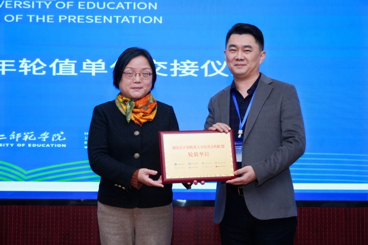 在会议上,举行了湖北省计算机类专业人才培养合作联盟轮值单位交接仪式,标志着我院将在2025年接任该联盟轮值单位的职责。我院院长田浩在交接仪式上向参会高校发出邀请,表态会当好新的东道主。
