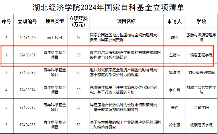 近日,国家自然科学基金委员会公布了2024年度国家自然科学基金集中申请项目评审结果,我院青年博士左乾坤老师申请的《面向阿尔茨海默病医学影像的有效连接脑网络构建与分析方法研究》课题获青年科学基金项目立项,资助金额30万元。